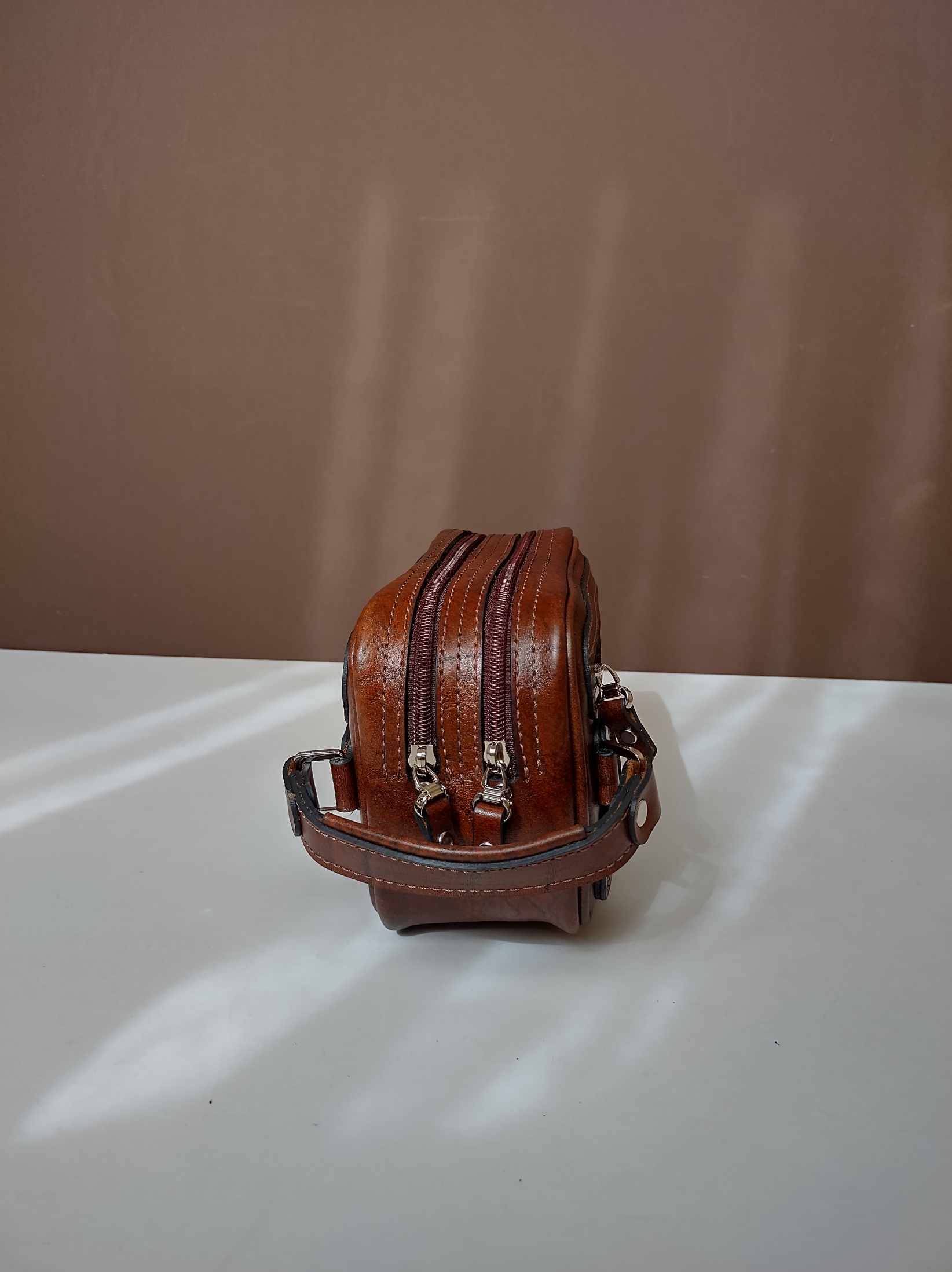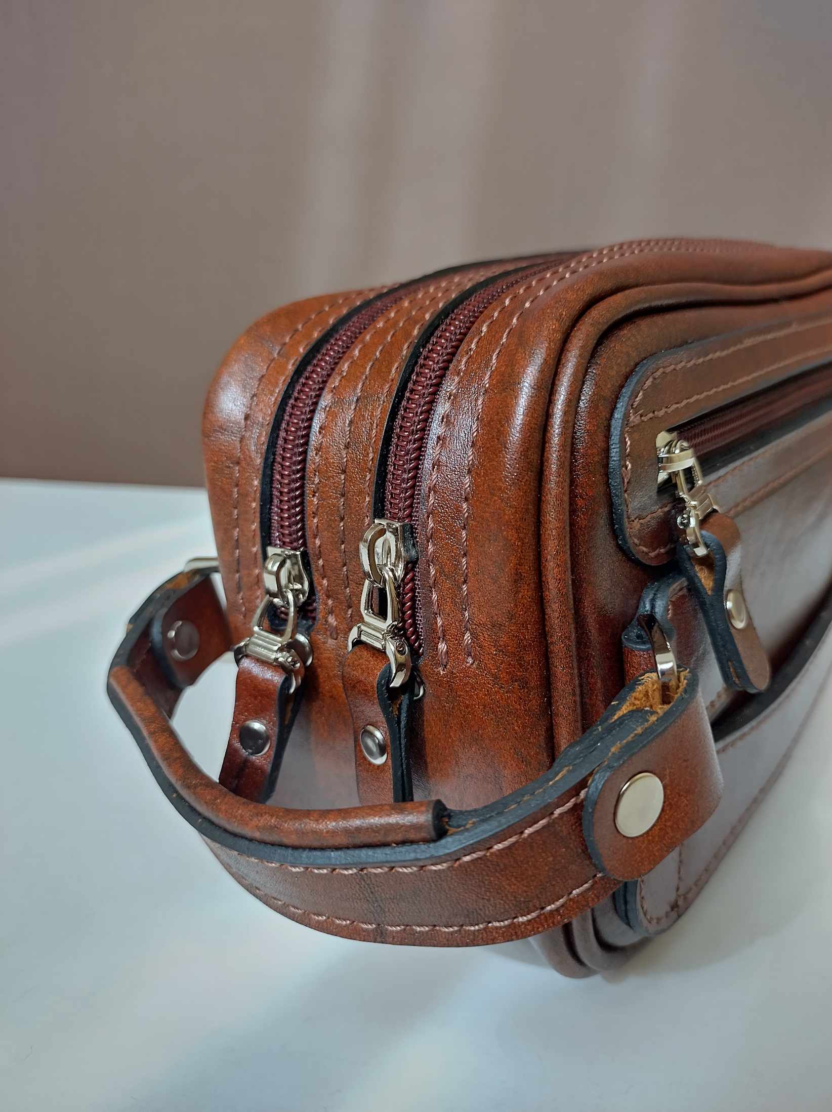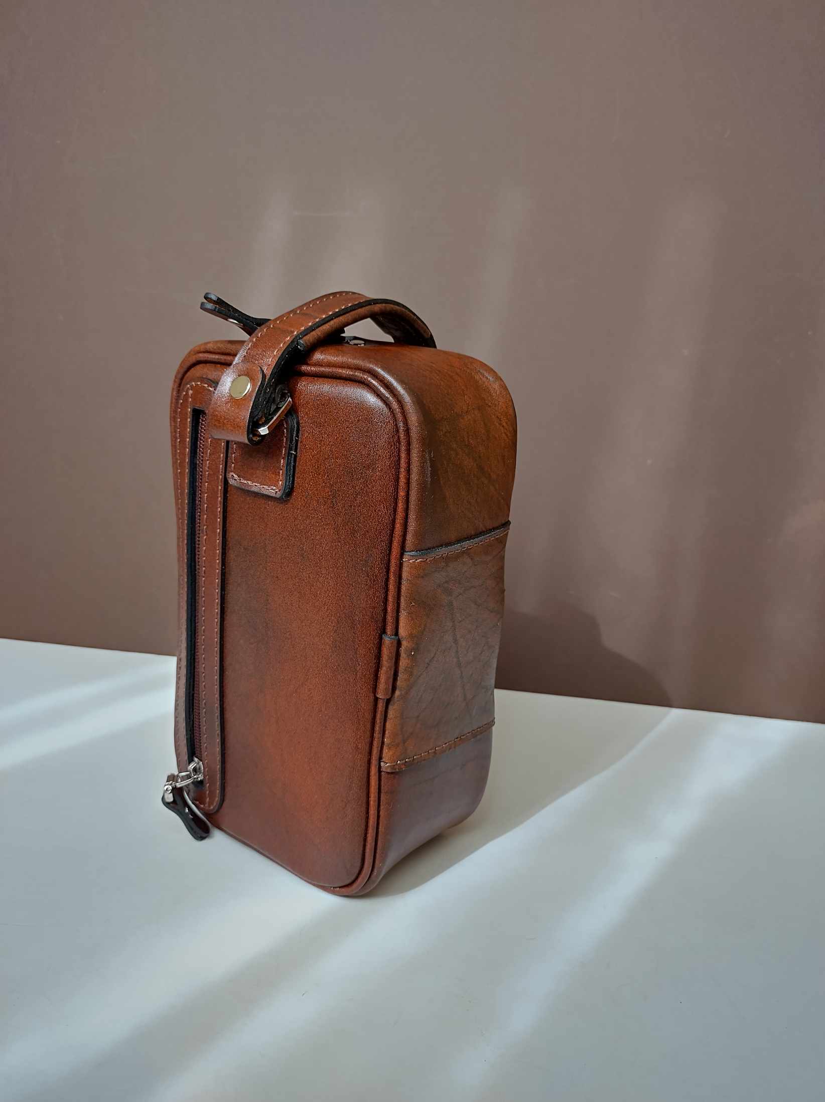 شوزبگ مردانه دوخته شده با چرم طبیعی مرغوب گاوی رنگ فندقی یراق آلات درجه یک وارداتی چرم بدون نازک سازی
