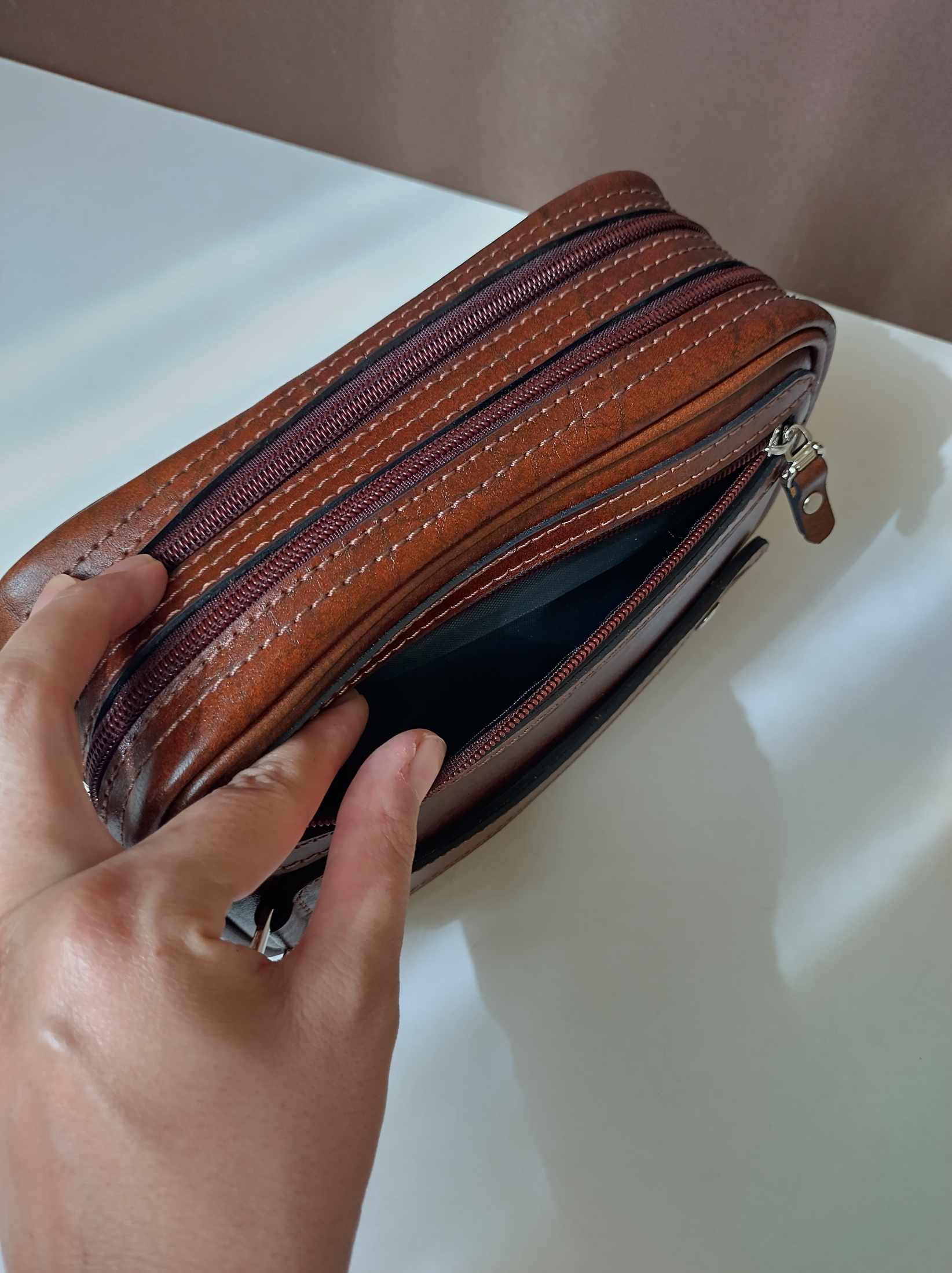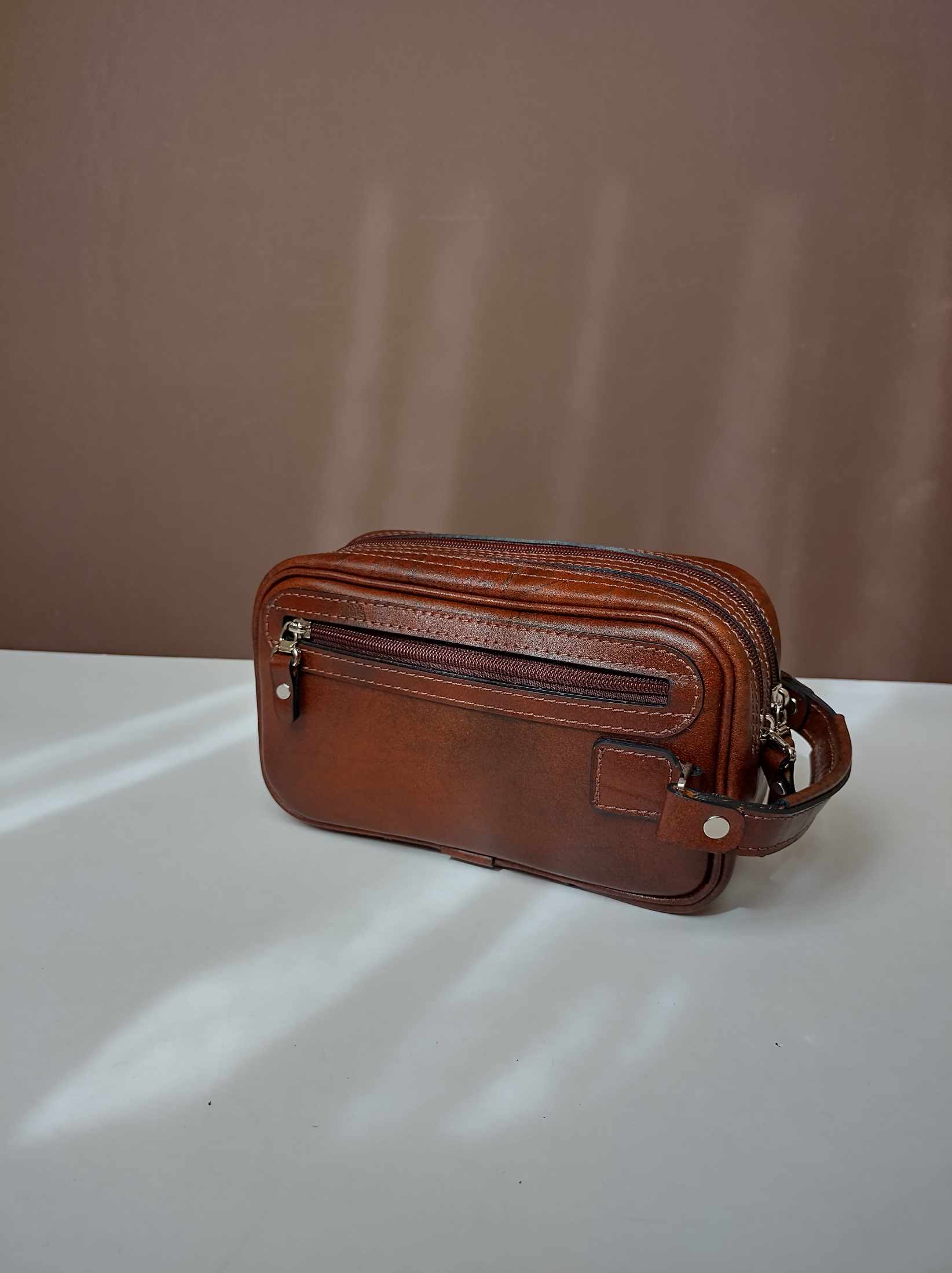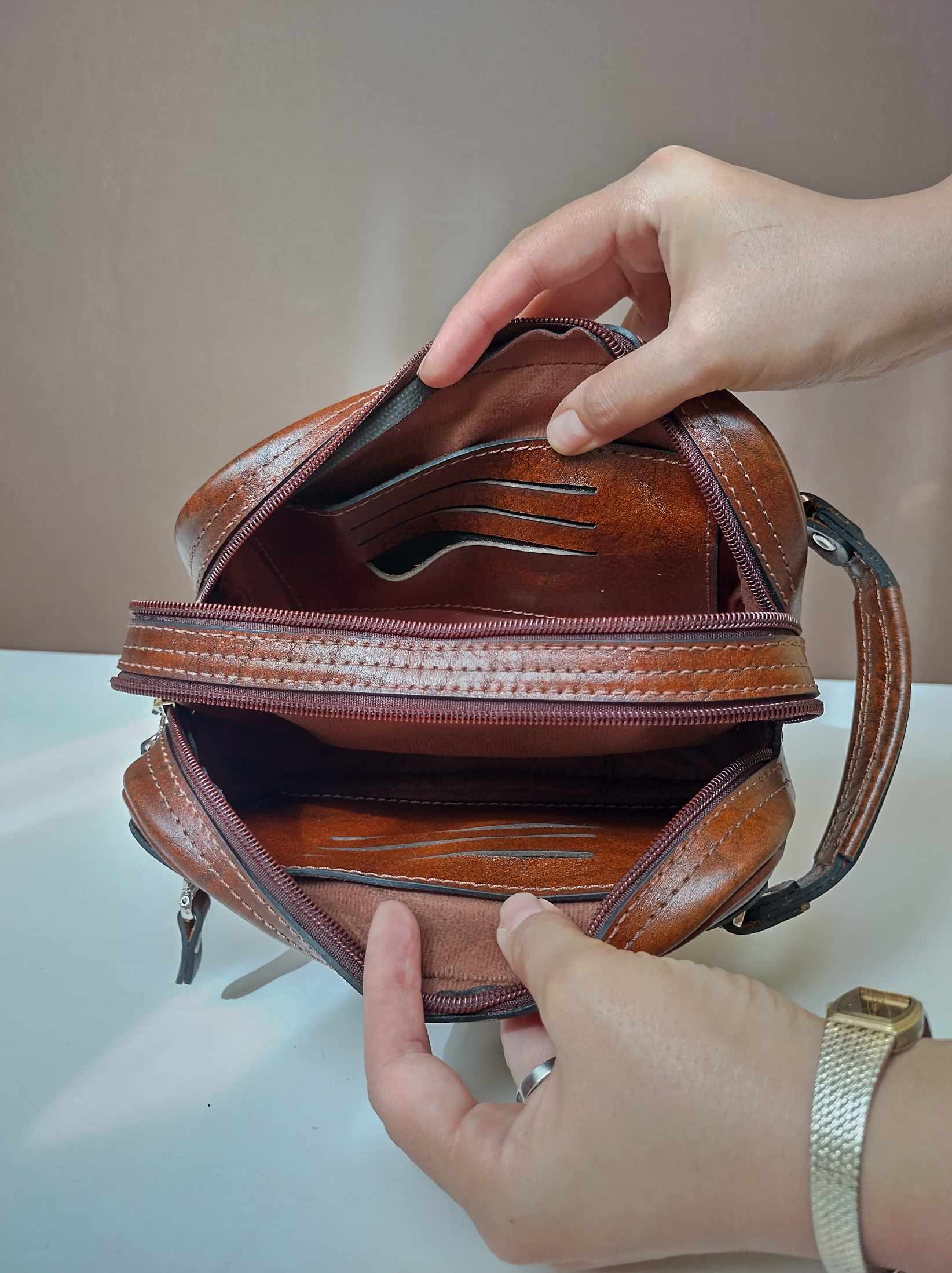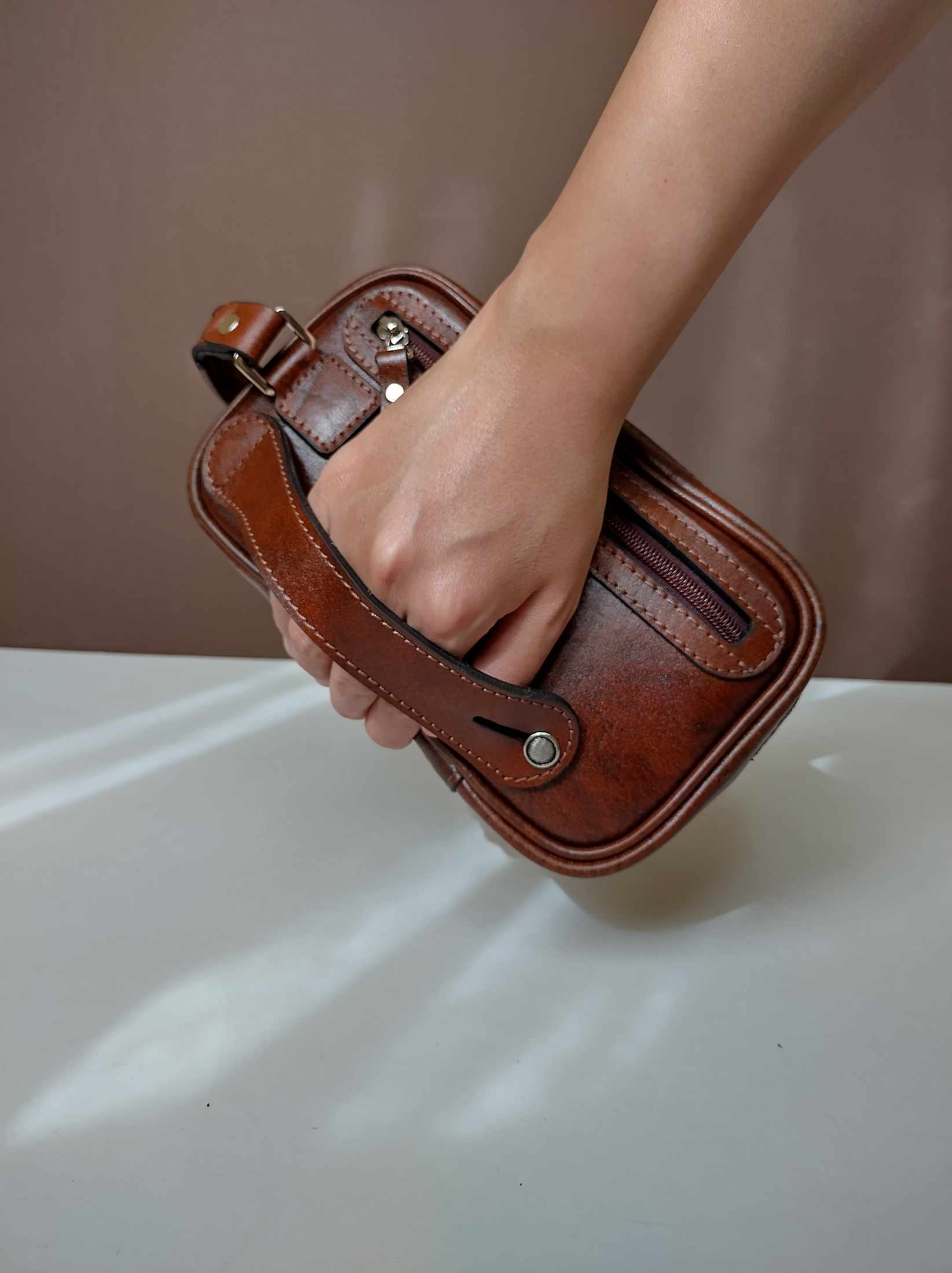شوزبگ مردانه دوخته شده با چرم طبیعی مرغوب گاوی رنگ فندقی یراق آلات درجه یک وارداتی چرم بدون نازک سازی