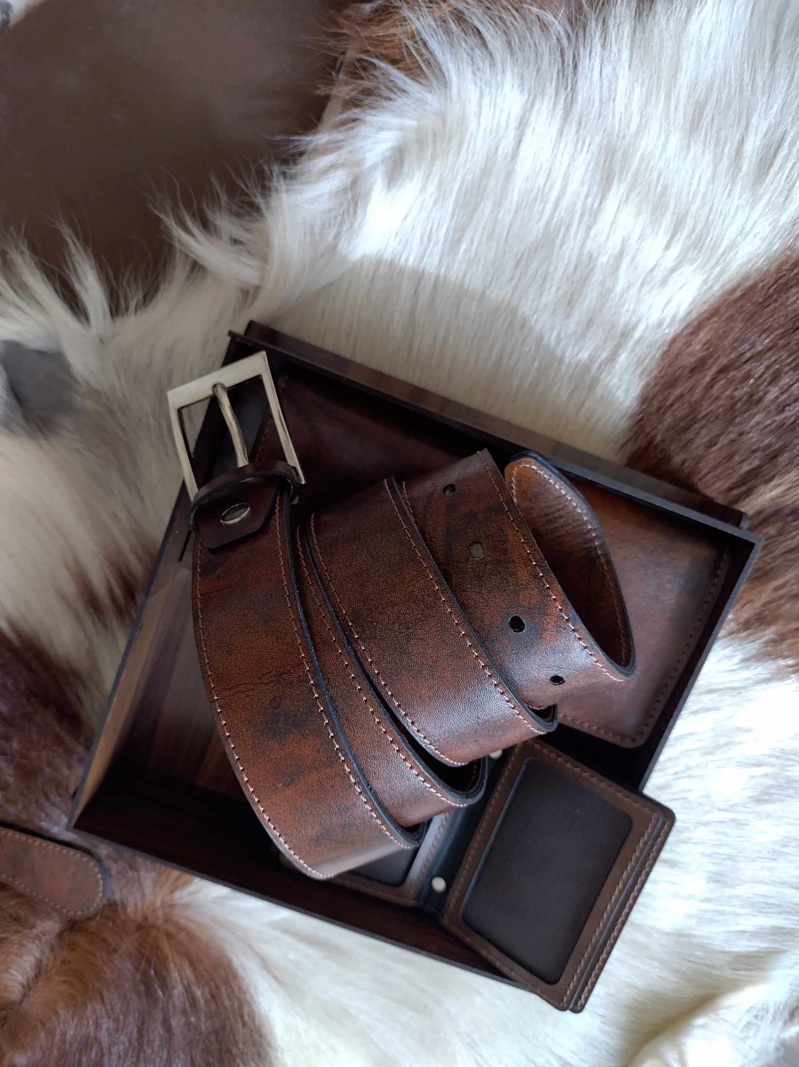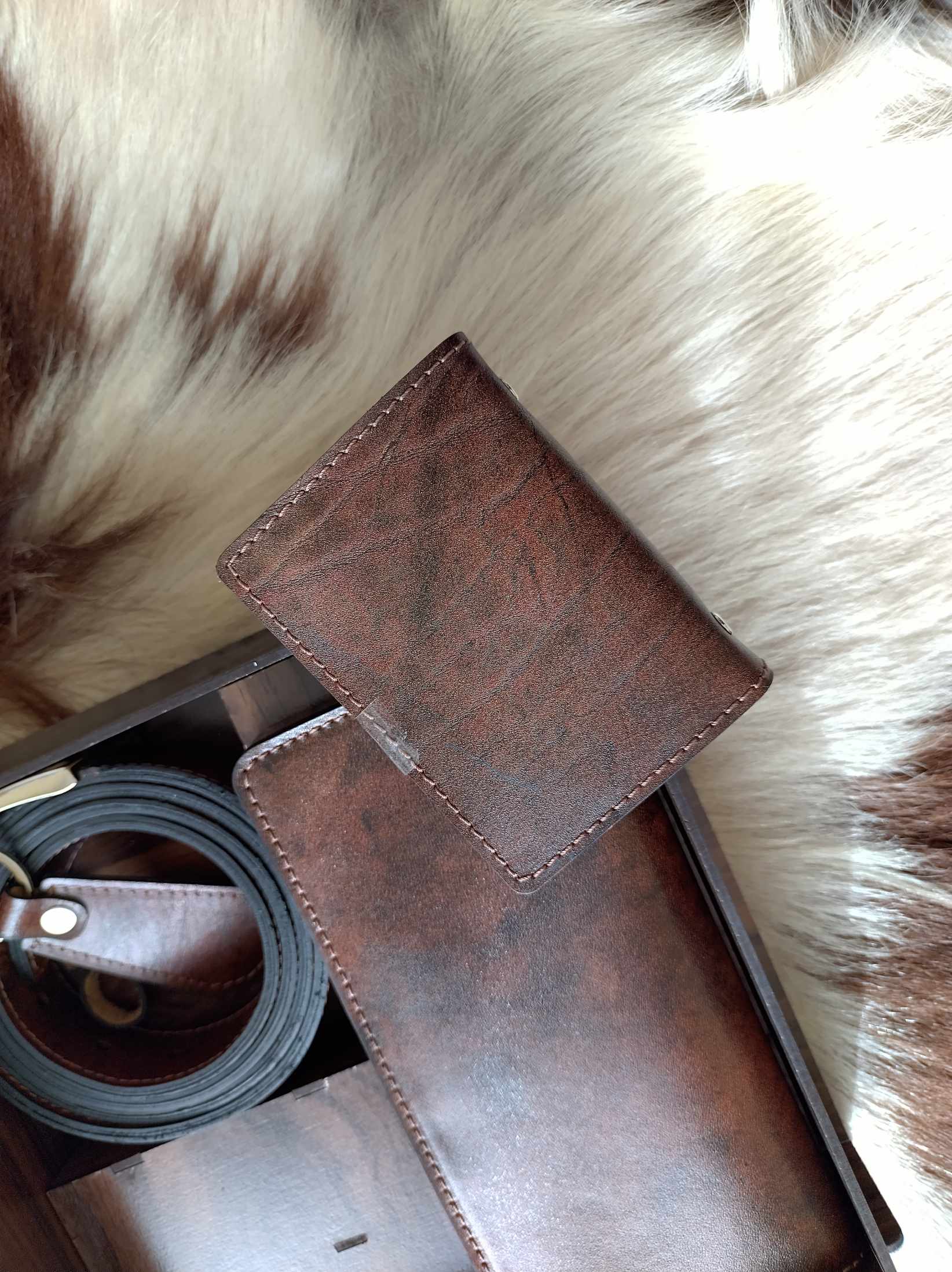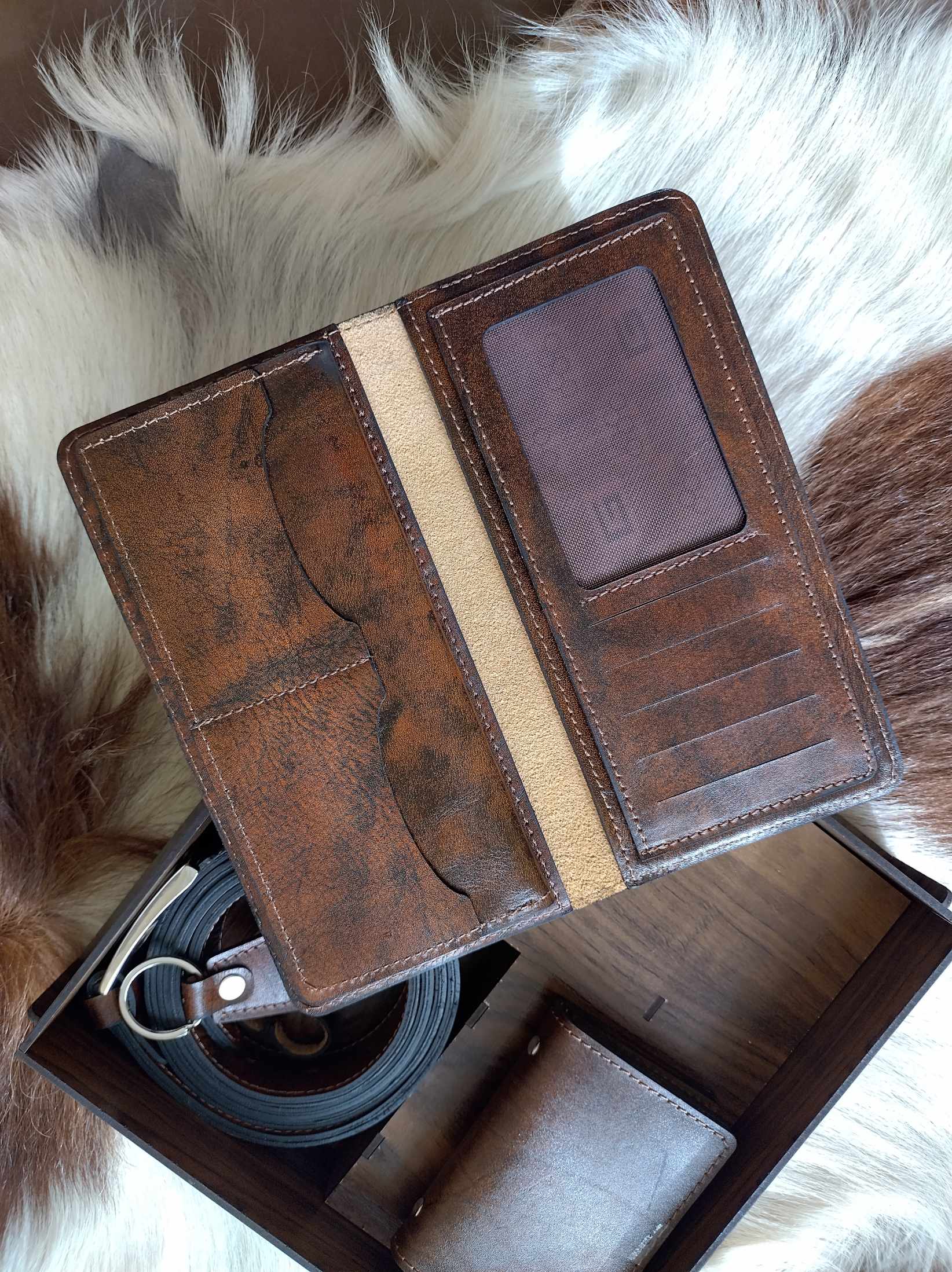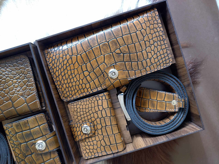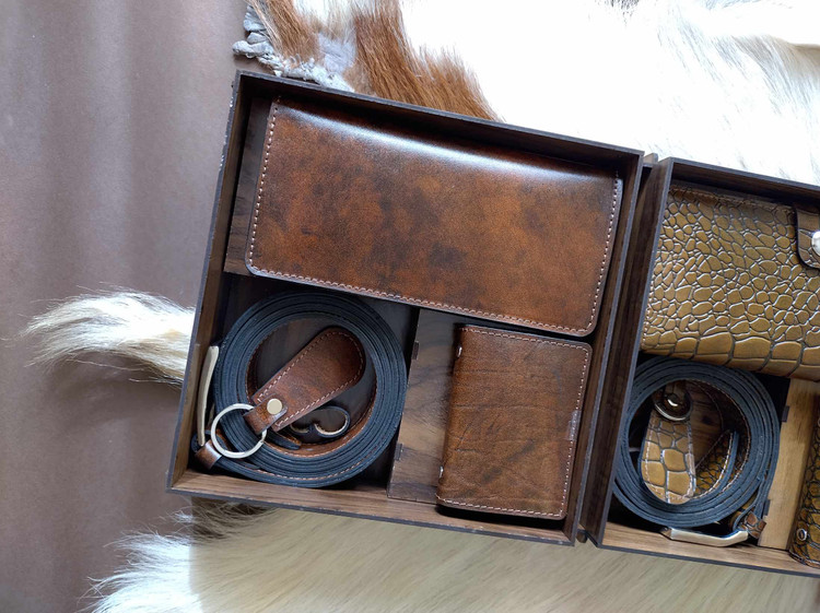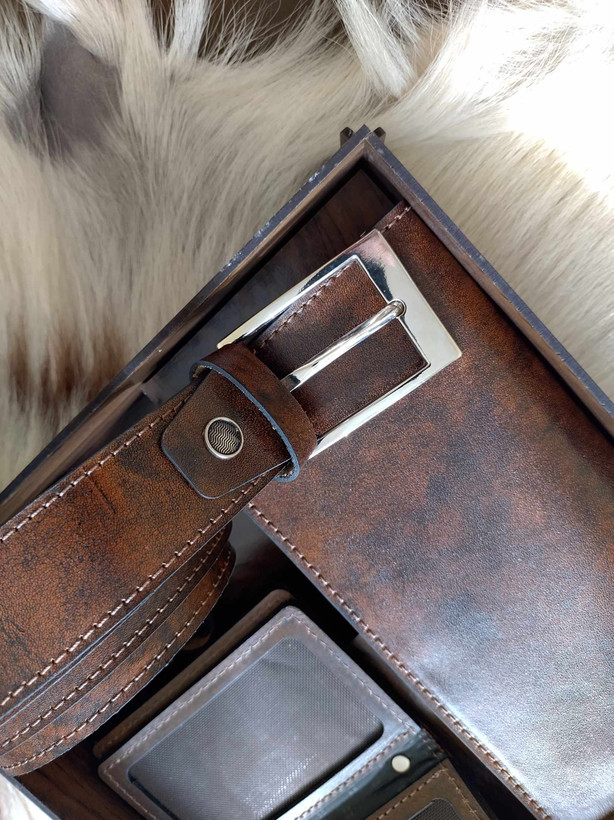 ست مردانه چرم طبیعی با جعبه چوبی(دوخت سفارشی)