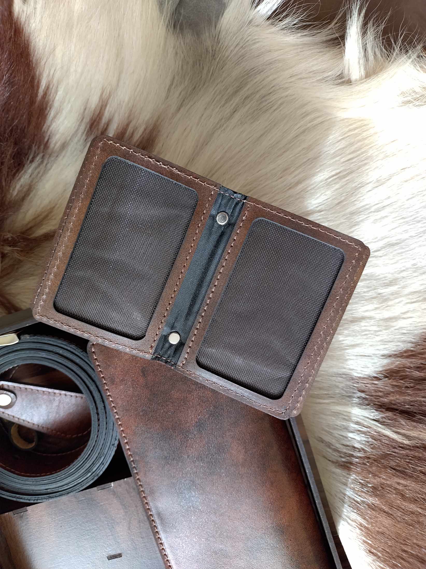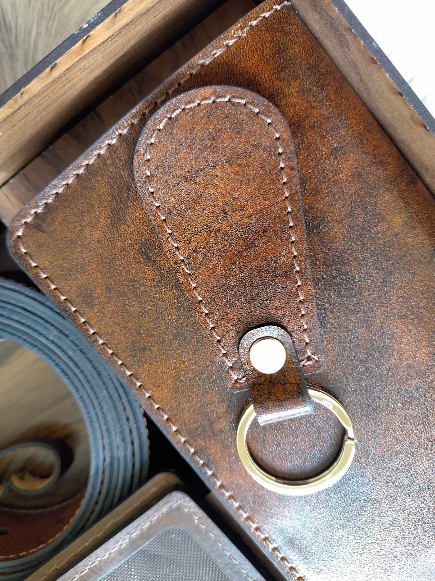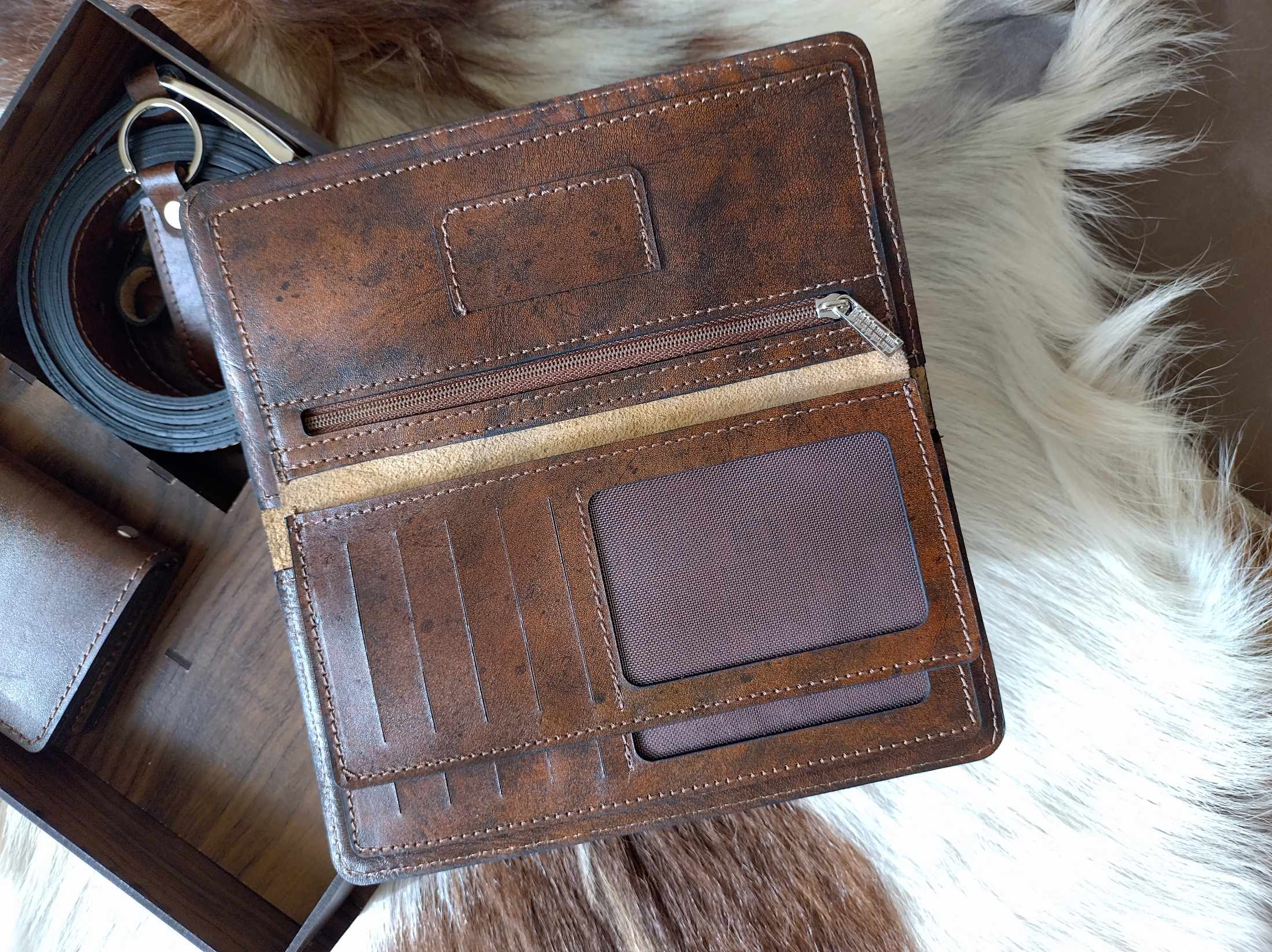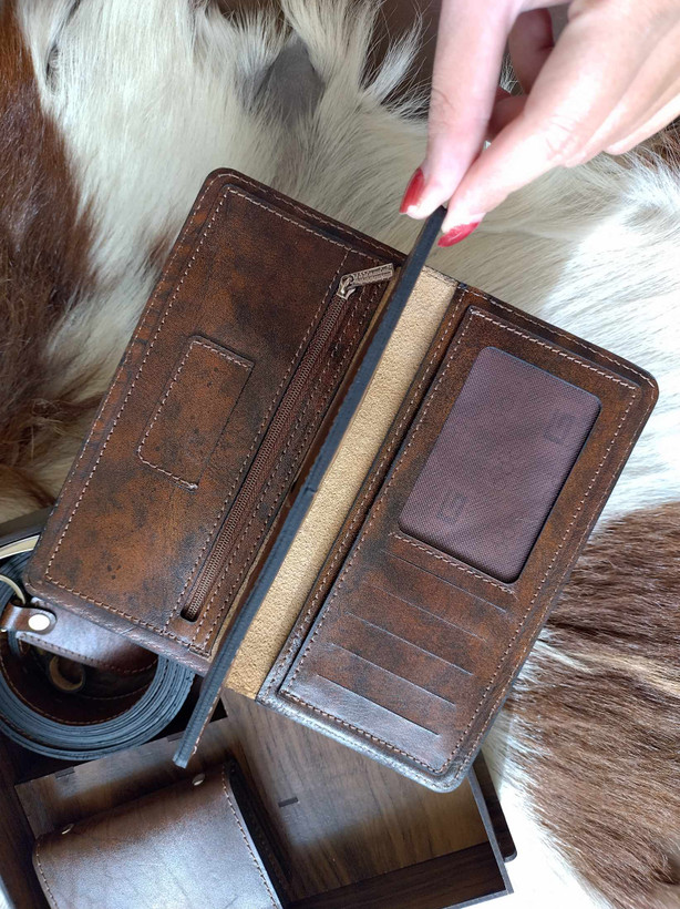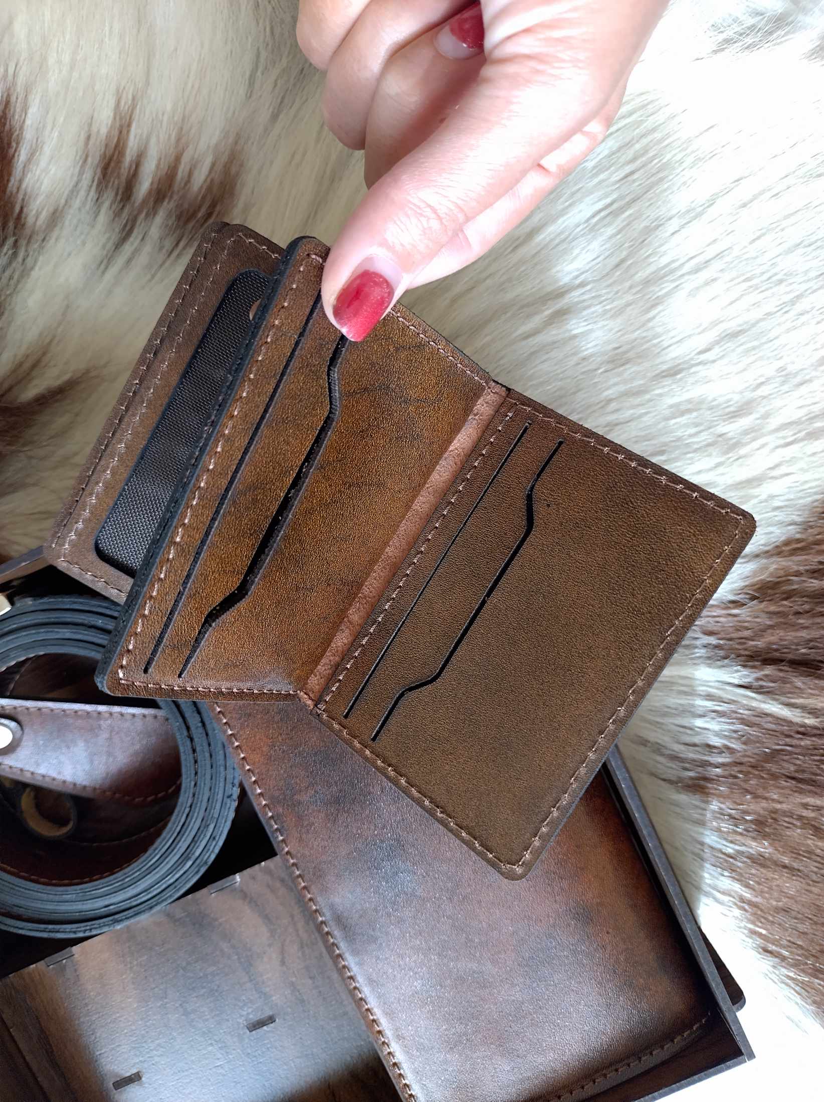 ست مردانه چرم طبیعی با جعبه چوبی(دوخت سفارشی)